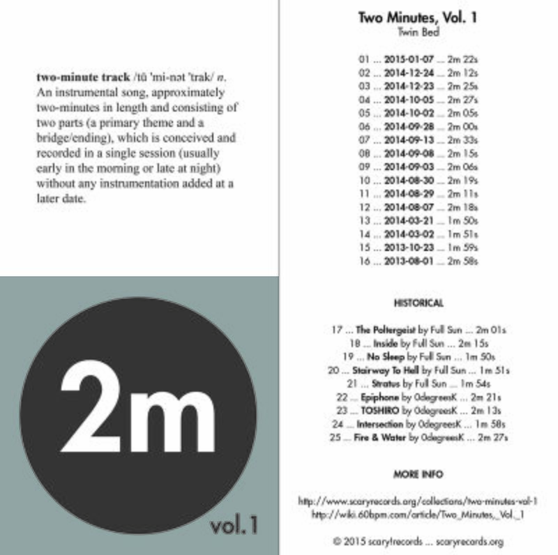 Two Minutes, Vol. 1 is a collection of music assembled in January 2015. The new material was contributed by 0degreesK, but historical tracks from the scary!records library that fit the Two-Minute Track format were included as well.