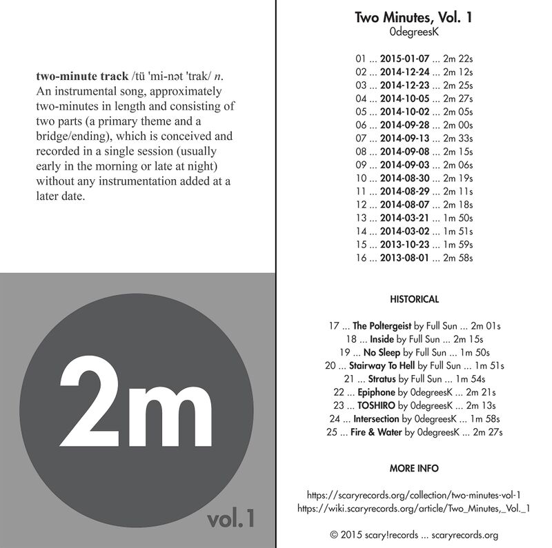 Two Minutes, Vol. 1 is a collection of music assembled in January 2015. The new material was contributed by 0degreesK, but historical tracks from the scary!records library that fit the Two-Minute Track format were included as well.